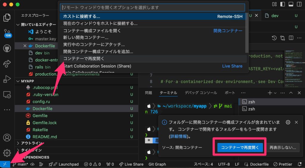 その状態でRailsプロジェクトを開くと、右下に通知が出てくるのでコンテナーで再度開く をクリックします。
